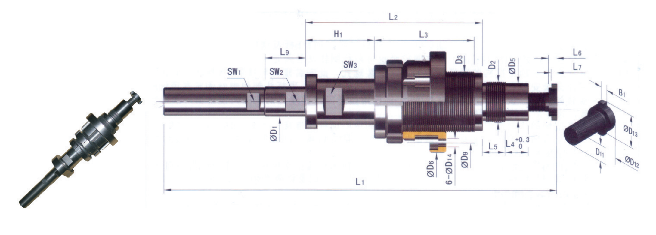 旋轉外牙套,調節(jié)外牙套與法蘭的相對位置即可在規(guī)定的范圍內設定第一次頂出行程 “S1”的位置,設定后再將法蘭鎖緊;