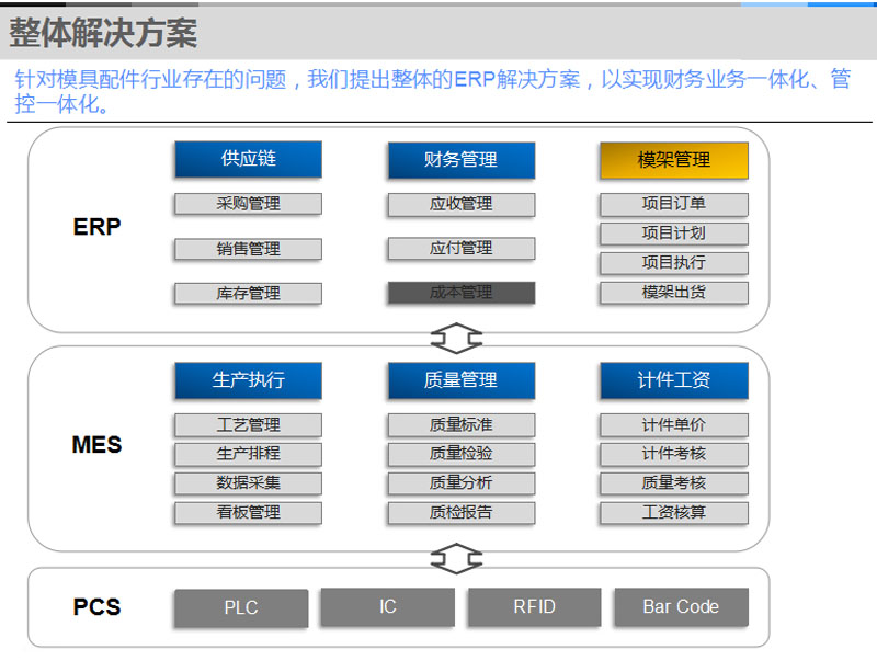 針對模具配件廠商存在的管理難點,提出了“ERP+MES”的綜合解決方案,實現(xiàn)財務(wù)業(yè)務(wù)一體化、管控一體化。